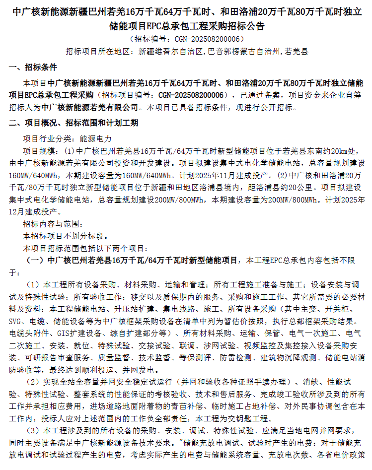 中國儲能網(wǎng)訊:8月25日,中廣核發(fā)布新疆巴州若羌160MW/640MWh、和田洛浦200MW/800MWh獨(dú)立儲能項(xiàng)目EPC總承包工程采購。