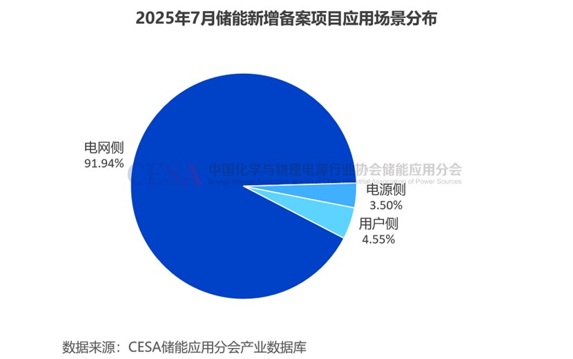 據(jù)CESA儲(chǔ)能應(yīng)用分會(huì)產(chǎn)業(yè)數(shù)據(jù)庫(kù)不完全統(tǒng)計(jì),2025年7月,國(guó)內(nèi)電網(wǎng)側(cè)儲(chǔ)能新增備案已披露規(guī)模49.19GW/128.37GWh,占比91.44%(功率)/91.94%(容量);電源側(cè)儲(chǔ)能新增備案1.44GW/4.89GWh,占比2.68%(功率)/3.50%(容量);用戶側(cè)儲(chǔ)能新增已披露規(guī)模2.96GW/6.36GWh,占比5.50%(功率)/4.55%(容量)。