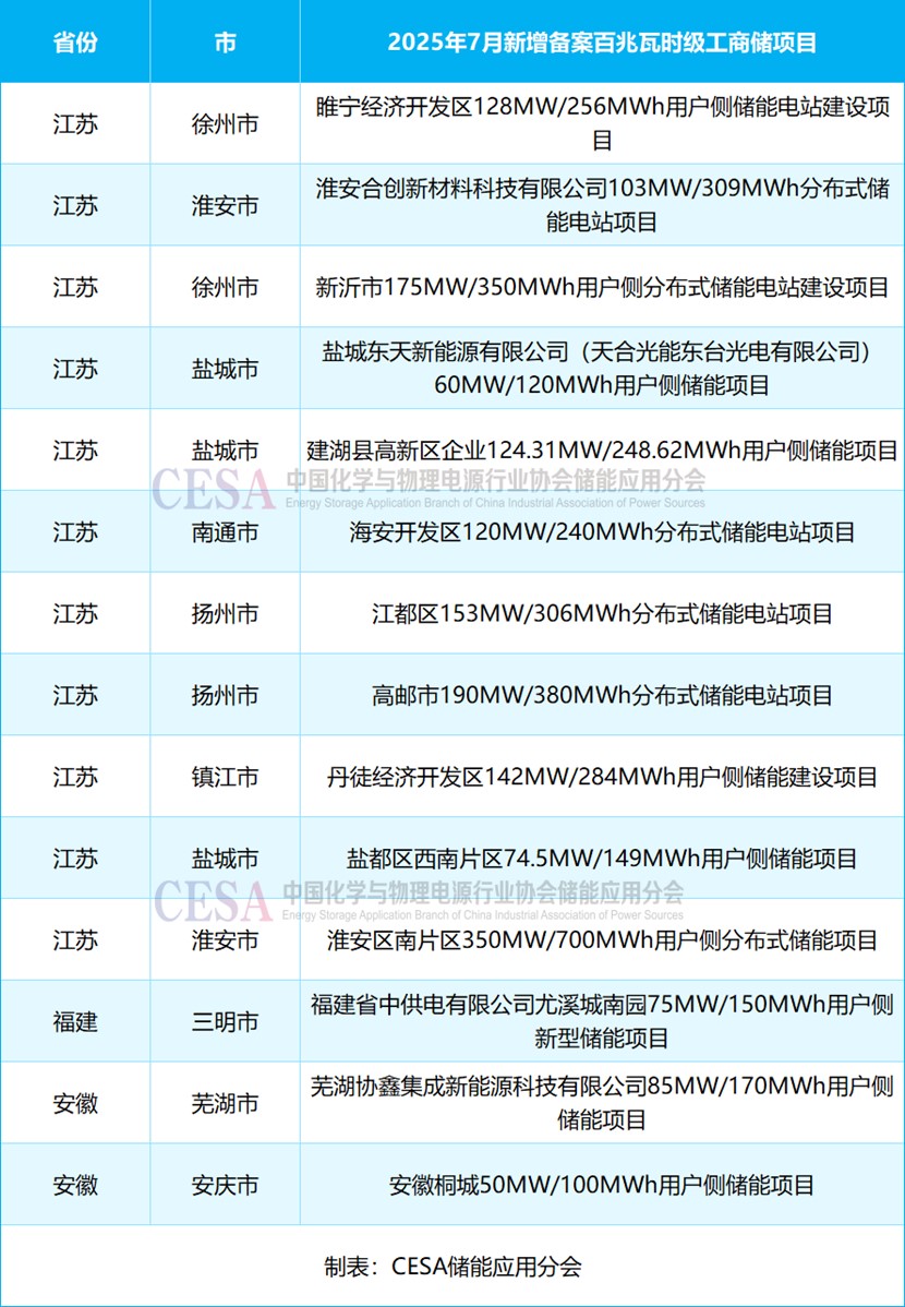 表 2025年7月新增備案百兆瓦時(shí)級(jí)工商儲(chǔ)項(xiàng)目