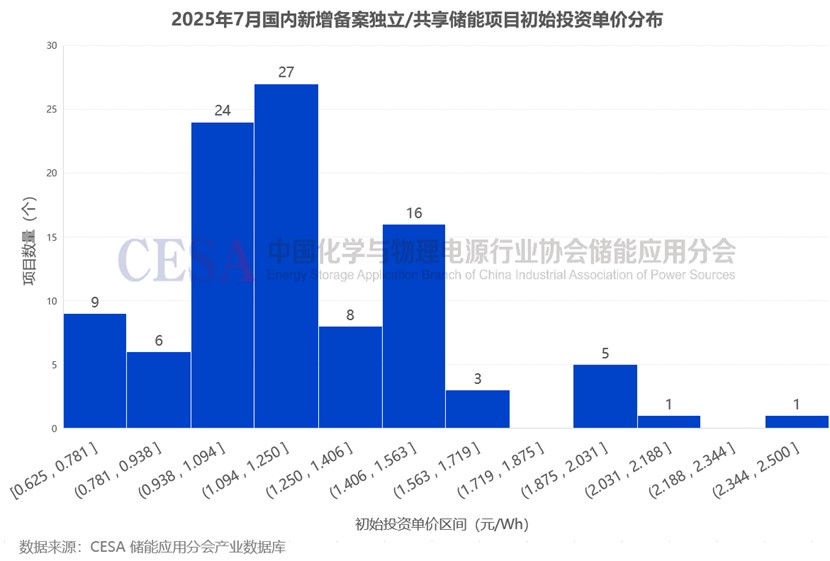 據(jù)CESA儲(chǔ)能應(yīng)用分會(huì)產(chǎn)業(yè)數(shù)據(jù)庫(kù)不完全統(tǒng)計(jì),2025年7月,國(guó)內(nèi)共新增備案了271個(gè)獨(dú)立/共享儲(chǔ)能項(xiàng)目,其中鋰電獨(dú)立/共享儲(chǔ)能(不包括含鋰電池的混合儲(chǔ)能)項(xiàng)目共236個(gè),其中100個(gè)項(xiàng)目披露了初始投資單價(jià),在0.625-2.5元/Wh區(qū)間內(nèi),平均初始投資單價(jià)1.227元/Wh。