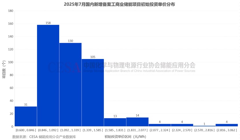 2025年7月新增備案的867個(gè)獨(dú)立配置工商業(yè)儲(chǔ)能項(xiàng)目中,有464個(gè)披露了初始投資單價(jià)(剔除異常報(bào)價(jià)后),集中在0.6-3.062元/Wh范圍內(nèi),平均初始投資單價(jià)1.235元/Wh。