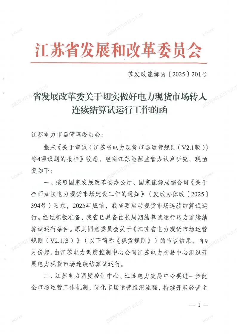 8月22日,江蘇電力市場管理委員會審議表決通過《江蘇省電力現貨市場運營規(guī)則(V2.1版)》。會后,江蘇電力市場管理委員會按要求將《關于審議<江蘇省電力現貨市場運營規(guī)則(V2.1版)>等4項議題的報告》呈報至江蘇省能源局、江蘇能源監(jiān)管辦。8月26日,委員會收到《省發(fā)展改革委關于切實做好電力現貨市場轉入連續(xù)結算試運行工作的函》(詳見附件)。特此通知。