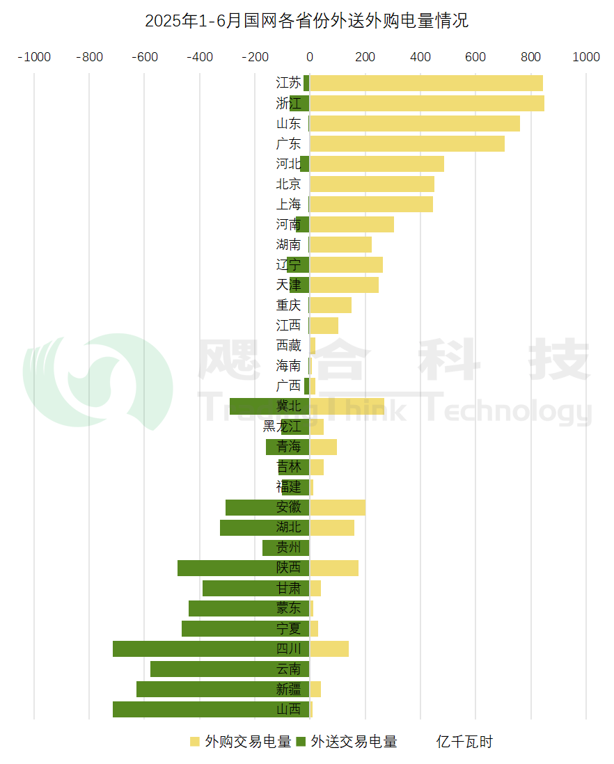 下圖的條形圖為2025年上半年各省份外送、外購電量情況,其中涉及南網(wǎng)區(qū)域的廣東、廣西、海南、云南、貴州5個省份采用南方區(qū)域電力交易中心披露的省間聯(lián)絡(luò)線輸電情況數(shù)據(jù)進行統(tǒng)計。