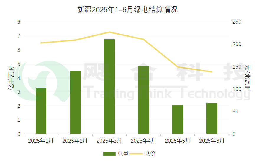 2025年1-6月新疆省內(nèi)綠電結(jié)算電量23.66億千瓦時,結(jié)算均價202.33元/兆瓦時。