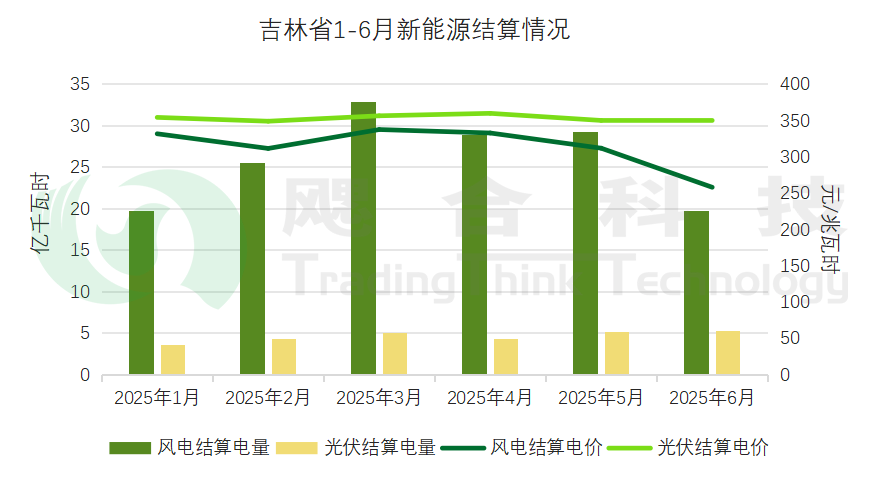 吉林新能源機組電能量結(jié)算均價情況如下:風電機組總計結(jié)算電量為155.78億千瓦時,結(jié)算電價為316.94元/兆瓦時;光伏機組結(jié)算電量為27.61億千瓦時,結(jié)算電價為353.53元/兆瓦時。