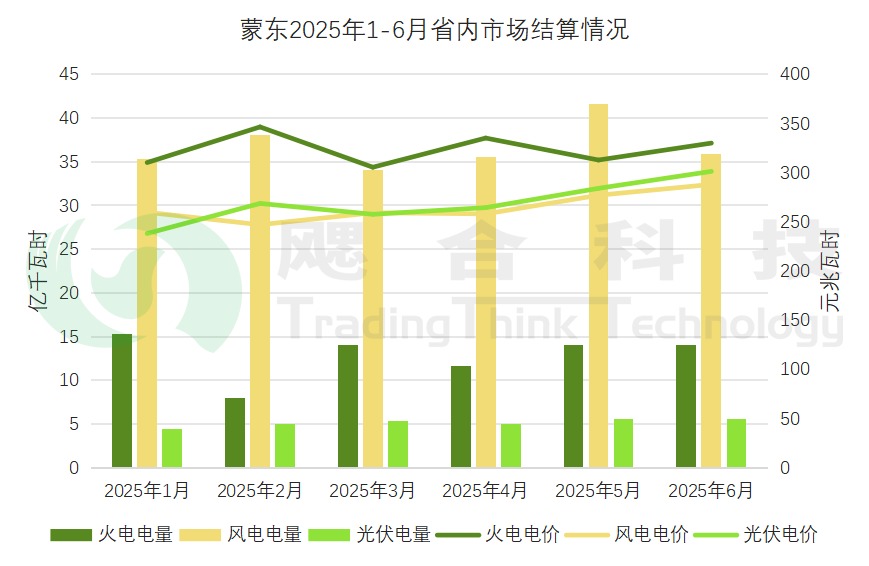 2025年1-6月,蒙東省內(nèi)市場累計結(jié)算電量328.36億千瓦時,其中火電結(jié)算電量77.02億千瓦時,結(jié)算均價321.04元/兆瓦時;風電結(jié)算電量220.44億千瓦時,結(jié)算均價265.1元/兆瓦時;光伏結(jié)算電量30.9億千瓦時,結(jié)算均價270.39元/兆瓦時。