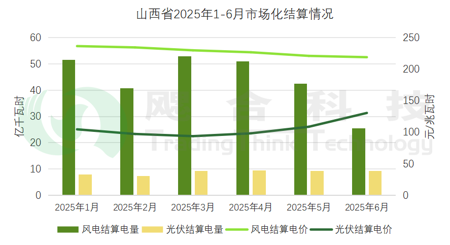 2025年1-6月,山西現(xiàn)貨機組風電結(jié)算電量264.02億千瓦時,結(jié)算均價228.97元/兆瓦時,光伏結(jié)算電量52.66億千瓦時,結(jié)算均價105.87元/兆瓦時。