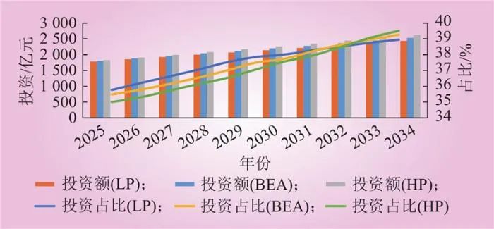 如圖8所示保障電網(wǎng)安全性的投資及其占比整體都呈現(xiàn)出上升的趨勢(shì),2025—2035年期間,HP情景投資高于BEA情景,BEA情景又高于LP情景,但投資占比與投資額表現(xiàn)出相反的趨勢(shì)。