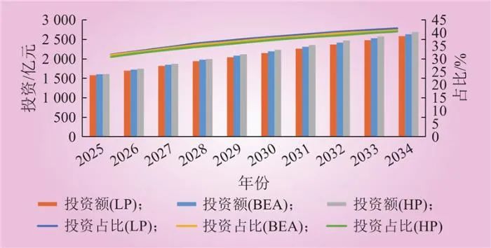 圖3所示3個(gè)情景下的電源接入投資額及其占比都呈現(xiàn)波動(dòng)下降的趨勢(shì),BEA和LP情景的波動(dòng)性更強(qiáng),這一波動(dòng)性也導(dǎo)致了不同情景下接入投資占比趨勢(shì)線存在交叉,2025—2027年,LP情景下的電源接入投資占比最高;2027—2030年,HP情景下的電源接入投資占比最高,BEA情景次之;2030—2035年則是BEA的電源接入投資占比最高。