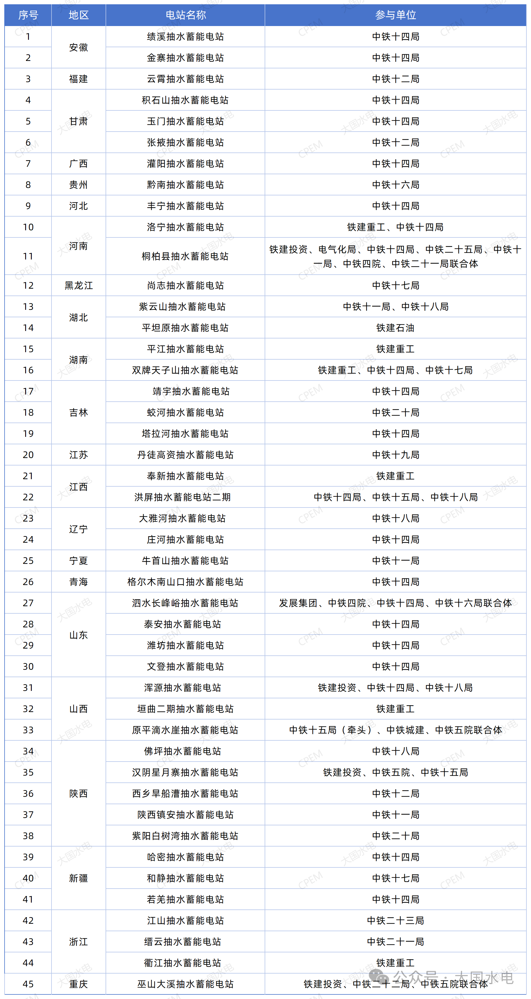 2023年后,中國鐵建在抽水蓄能領域進入快速發(fā)展期,參與多個國家級重點工程。據CPEM、大國水電不完全統(tǒng)計,中國鐵建參與的抽水蓄能項目遍布了全國20多個省份,總計約45個,如下: