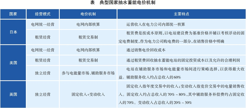 現(xiàn)階段,日本抽水蓄能電站主要采用租賃制(電源開發(fā)商參與)和內(nèi)部核算制(電力公司主導(dǎo));美國則以電網(wǎng)統(tǒng)一運營模式為主(抽蓄電站約占70%),輔以租賃運營和少量獨立運營,直接參與電力市場的比例較低;英國抽水蓄能電站雖然總體規(guī)模有限,但其高度市場化的發(fā)電側(cè)環(huán)境使其能夠作為獨立成員參與市場,其收入明確區(qū)分為年度交易的固定收入與競價交易的變動收入兩部分,構(gòu)成典型的兩部制電價模式(見表)。