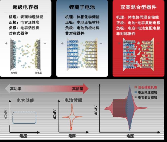 超級(jí)電容器、鋰離子電池與雙高混合型器件機(jī)理對(duì)比。