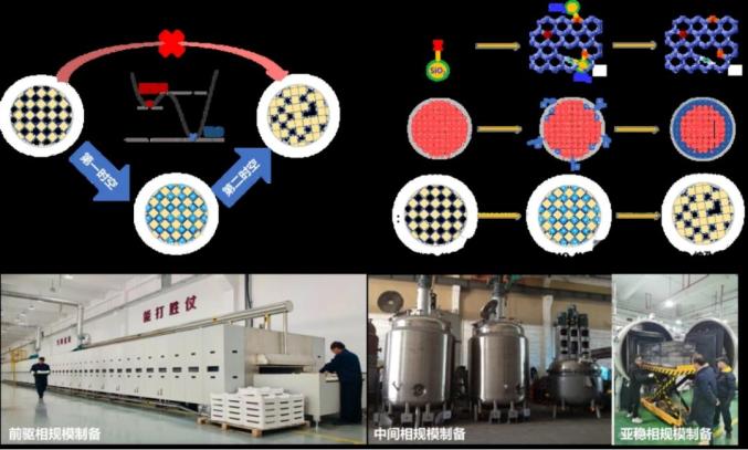 為此,團(tuán)隊(duì)發(fā)明了“多時(shí)空拓?fù)湓S可”制備新技術(shù),制備復(fù)雜功能材料。他們將熱力學(xué)禁阻的“同時(shí)空”單步反應(yīng),拆解為熱力學(xué)許可的“多時(shí)空”分步反應(yīng),通過(guò)精準(zhǔn)調(diào)控反應(yīng)時(shí)間與空間,使原本相互排斥的化學(xué)反應(yīng)在時(shí)間序列上依次發(fā)生,成功實(shí)現(xiàn)亞穩(wěn)相材料的可控量產(chǎn),讓原本“水火不容”的兩種工藝在材料制備中和諧共存,最終在材料中形成“體相-表層”復(fù)合結(jié)構(gòu),開(kāi)辟了分階段構(gòu)筑復(fù)雜多功能材料的全新路徑。