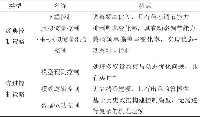 設(shè)計(jì)恰當(dāng)?shù)目刂撇呗詫τ诒U铣夒娙菰谡{(diào)頻過程中精準(zhǔn)出力至關(guān)重要,現(xiàn)有的控制策略大致可以分為兩類:經(jīng)典控制策略和先進(jìn)控制策略。經(jīng)典控制策略主要包括下垂控制、虛擬慣量控制,以及基于二者的混合控制。先進(jìn)控制策略主要包括模型預(yù)測控制(model predictive control, MPC)、模糊邏輯控制(fuzzy logic control, FLC)和數(shù)據(jù)驅(qū)動(dòng)控制等。超級電容的調(diào)頻控制策略匯總?cè)绫?所示。