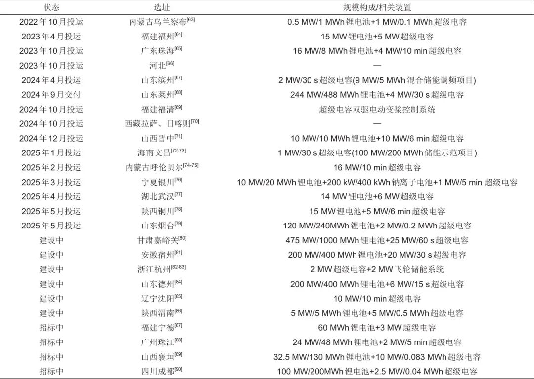 考慮合適的控制策略與容量配置方法,超級電容已逐漸成為電力系統(tǒng)調(diào)頻的關(guān)鍵技術(shù)。具體來說,通過考慮超級電容與電源、負(fù)荷的互動(dòng),將超級電容集成到原有電力系統(tǒng)中,不僅可以平衡能源之間的間歇性,還可以提供即時(shí)的能量支撐,增強(qiáng)電力系統(tǒng)的可靠性。目前,超級電容輔助電力系統(tǒng)調(diào)頻已有大量工程案例,其中,已投運(yùn)、建設(shè)中以及投標(biāo)中的部分典型工程案例見表3。