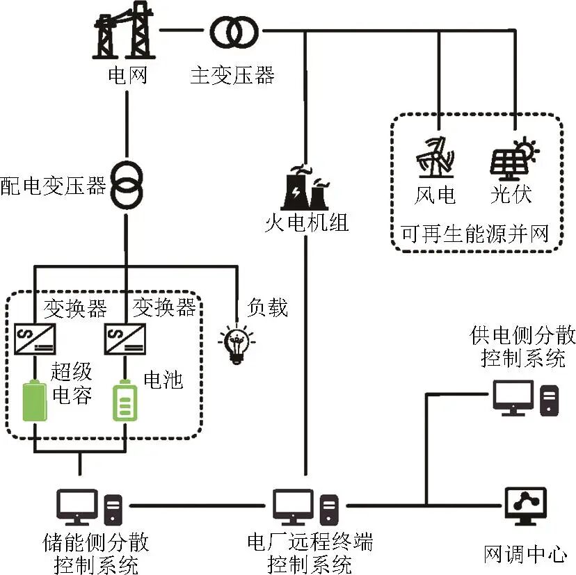 除作為獨(dú)立單元應(yīng)用于儲能調(diào)頻系統(tǒng)外,超級電容更常以混合儲能系統(tǒng)中的核心組件形式存在,其典型應(yīng)用模式為與鋰電池構(gòu)成混合儲能調(diào)頻系統(tǒng)。此類系統(tǒng)能夠快速充放電并精準(zhǔn)調(diào)節(jié)輸出功率,調(diào)頻效果遠(yuǎn)好于常規(guī)發(fā)電機(jī)組。其系統(tǒng)結(jié)構(gòu)如圖1所示,電源側(cè)整合火電與可再生能源形成互補(bǔ)發(fā)電體系;儲能側(cè)通過混合儲能調(diào)頻系統(tǒng)經(jīng)變換器實(shí)現(xiàn)能量雙向流動(dòng);控制系統(tǒng)涵蓋電廠遠(yuǎn)端、儲能就地控制及網(wǎng)調(diào)中心三級管理模塊,實(shí)現(xiàn)“源、網(wǎng)、荷、儲”協(xié)調(diào)控制,體現(xiàn)出混合儲能調(diào)頻系統(tǒng)在新型電力系統(tǒng)中的協(xié)同調(diào)頻機(jī)制。