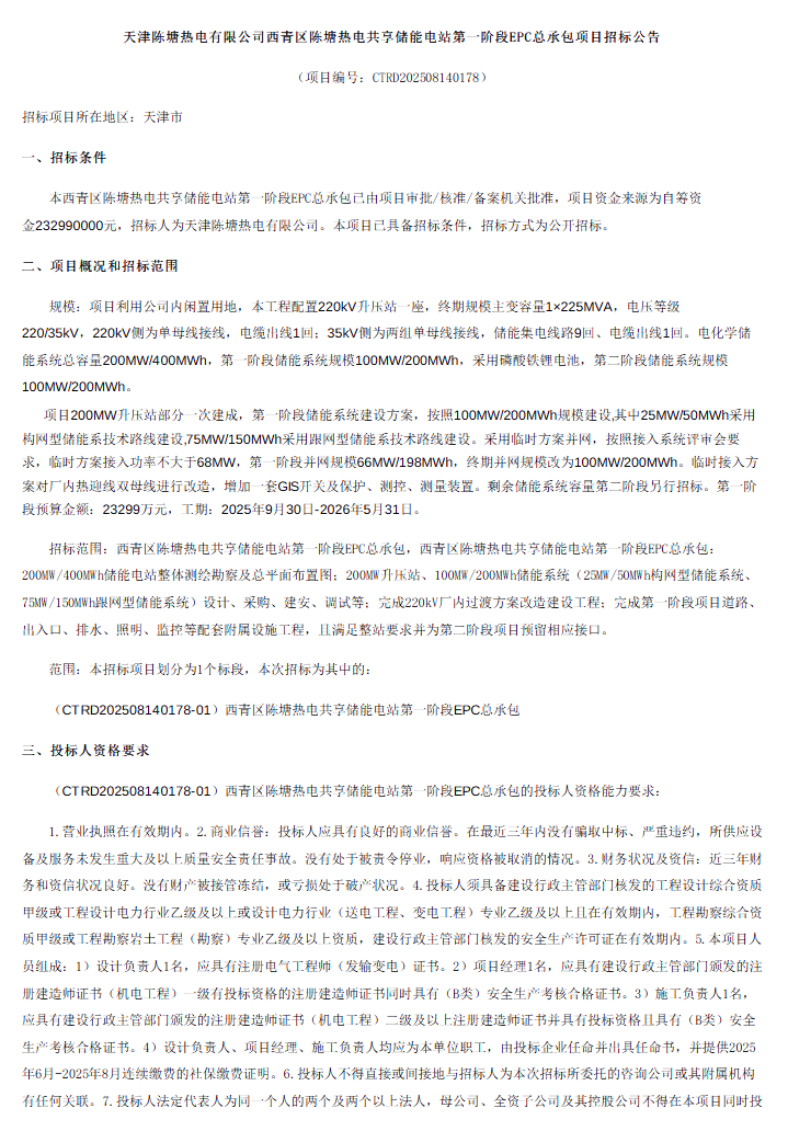 中國儲(chǔ)能網(wǎng)訊:8月30日,天津陳塘熱電有限公司西青區(qū)陳塘熱電共享儲(chǔ)能電站第一階段EPC總承包項(xiàng)目招標(biāo)公告發(fā)布。項(xiàng)目招標(biāo)人為天津能源投資集團(tuán)旗下的天津陳塘熱電有限公司,項(xiàng)目電化學(xué)儲(chǔ)能系統(tǒng)總?cè)萘?00MW/400MWh,第一階段儲(chǔ)能系統(tǒng)規(guī)模100MW/200MWh,采用磷酸鐵鋰電池,第二階段儲(chǔ)能系統(tǒng)規(guī)模100MW/200MWh。本次招標(biāo)范圍為第一階段EPC總承包。