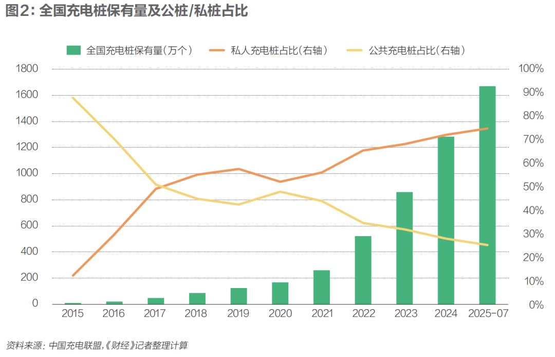 充電設施的普及對電車普及很重要,截至2025年7月,全國1669.6萬個充電樁中,公共樁420.2萬個,私人樁1249.4萬個。
