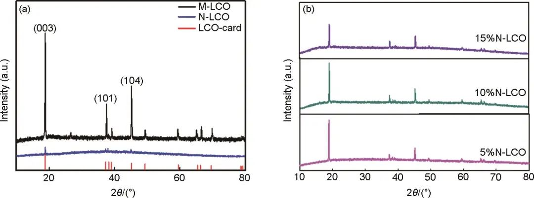 圖1 XRD譜圖 (a) M-LCO、N-LCO;(b) 5%N-LCO、10%N-LCO、15%N-LCO