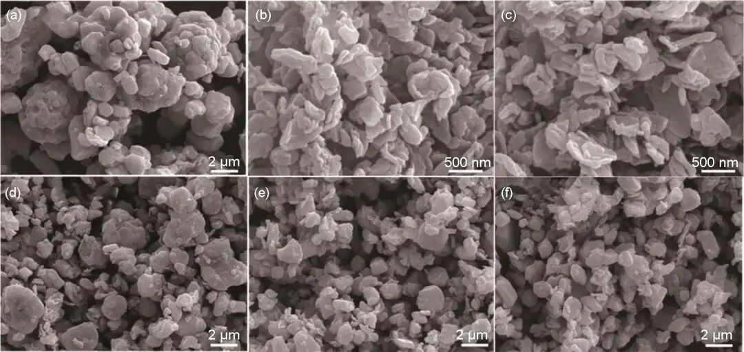 圖2 SEM照片 (a) M-LCO;(b)、(c) N-LCO;(d) 5%N-LCO;(e) 10%N-LCO;(f) 15%N-LCO