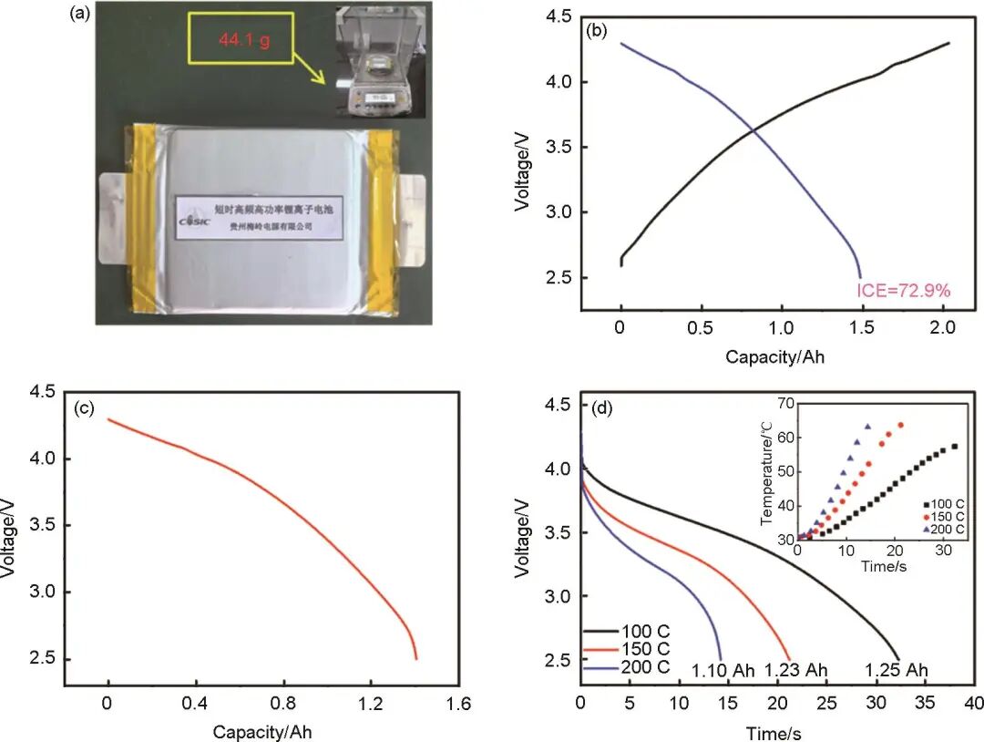 圖4 HC//10%N-LCO軟包電池的 (a) 實(shí)物照片;(b) 0.2 C首次充放電曲線;(c) 1 C放電曲線;(d) 100~200 C倍率放電曲線 (插圖是電池表面溫度的變化)