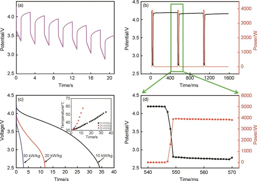 HC//10%N-LCO軟包電池在350 C倍率(500 A電流)下的1 s脈沖放電曲線如圖5(a)所示,在經(jīng)歷7次脈沖放電后,電池的放電終止電壓依然大于放電截止電壓2.5 V。隨后,對其進(jìn)行了1000 C毫秒級脈沖放電,如圖5(b)、(d)所示,在整個(gè)20 ms脈沖放電周期內(nèi),電池的放電功率都可維持在3900 W左右,結(jié)合電池單體質(zhì)量為44.1 g,其脈沖功率為88.44 kW/kg。可以看出,HC//10%N-LCO軟包電池具有極其優(yōu)異的脈沖放電能力。這是因?yàn)樵诩{/微結(jié)構(gòu)鈷酸鋰顆粒級配正電極中,納米顆粒填充至微米顆粒之間,能夠降低電極的迂曲度,改善電解液浸潤性,而微米級顆粒作為“導(dǎo)電骨架”,減小了納米顆粒間的接觸電阻,從而加快了電極的離子/電子傳輸,極大地提升了電池的功率性能。為了進(jìn)一步評估電池在特定功率輸出下的性能表現(xiàn),對HC//10%N-LCO軟包電池進(jìn)行了10 kW/kg、20 kW/kg和30 kW/kg恒功率放電[圖5(c)],持續(xù)放電功率分別為440 W、880 W和1320 W,可以看出,在上述功率條件下,電池分別可以持續(xù)放電34.1 s、11.9 s和3.1 s,具有優(yōu)異的功率輸出能力。在進(jìn)行恒功率放電的同時(shí),對軟包電池的表面在自然散熱的情況下進(jìn)行了監(jiān)測(環(huán)境溫度30 ℃),如圖5(d)中的插圖所示。在10 kW/kg、20 kW/kg和30 kW/kg放電結(jié)束時(shí)電池表面的溫度分別為52.9 ℃、57.7 ℃和33.4 ℃(溫升<30 ℃),溫升較大倍率恒流放電時(shí)更低。30 kW/kg恒功率放電時(shí)的溫升小于5 ℃,這是因?yàn)樵诖斯β拭芏认路烹姇r(shí)間只有3.1 s,電池內(nèi)部還沒有熱量積累。