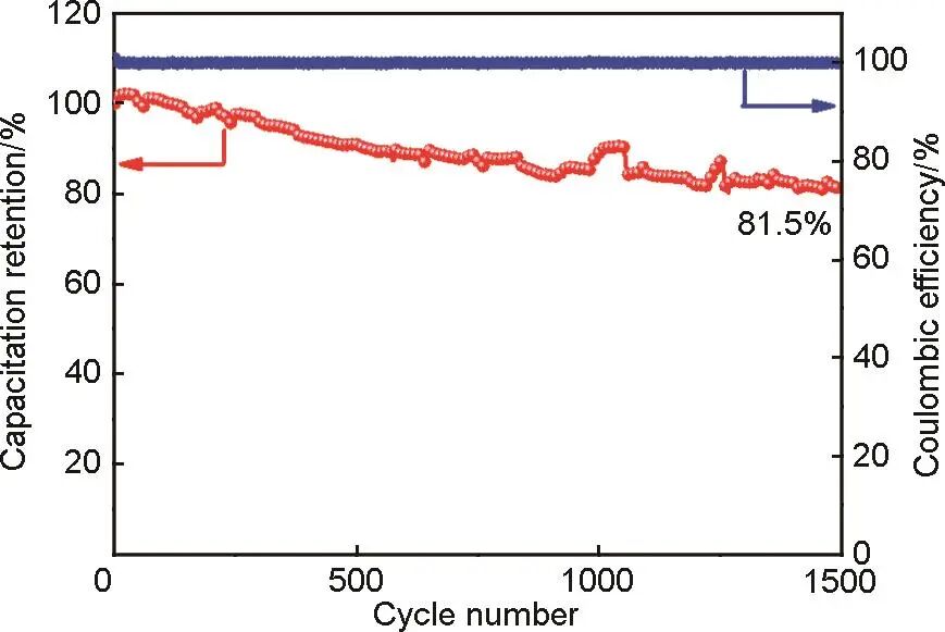 恒功率充放電更接近電池在實(shí)際應(yīng)用中的工作情況。為了進(jìn)一步測試電池在高功率下的循環(huán)性能,對HC//10%N-LCO軟包電池進(jìn)行充放電功率為30 W的循環(huán)性能測試,如圖6所示。經(jīng)過1500次循環(huán)之后,其容量保持率高達(dá)81.5%,且?guī)靵鲂示S持在接近100%,具有優(yōu)異的恒功率充放電循環(huán)性能。這可歸結(jié)于10%N-LCO材料中的納米顆粒的高比表面積和彈性,能夠通過表面形變和吸收充放電過程中的局部應(yīng)力,減少顆粒破碎。微米顆粒作為結(jié)構(gòu)骨架,能夠提供機(jī)械支撐,防止納米顆粒在長周期循環(huán)中發(fā)生團(tuán)聚或結(jié)構(gòu)坍塌,從而提升電池在高功率充放電條件下的循環(huán)性能。