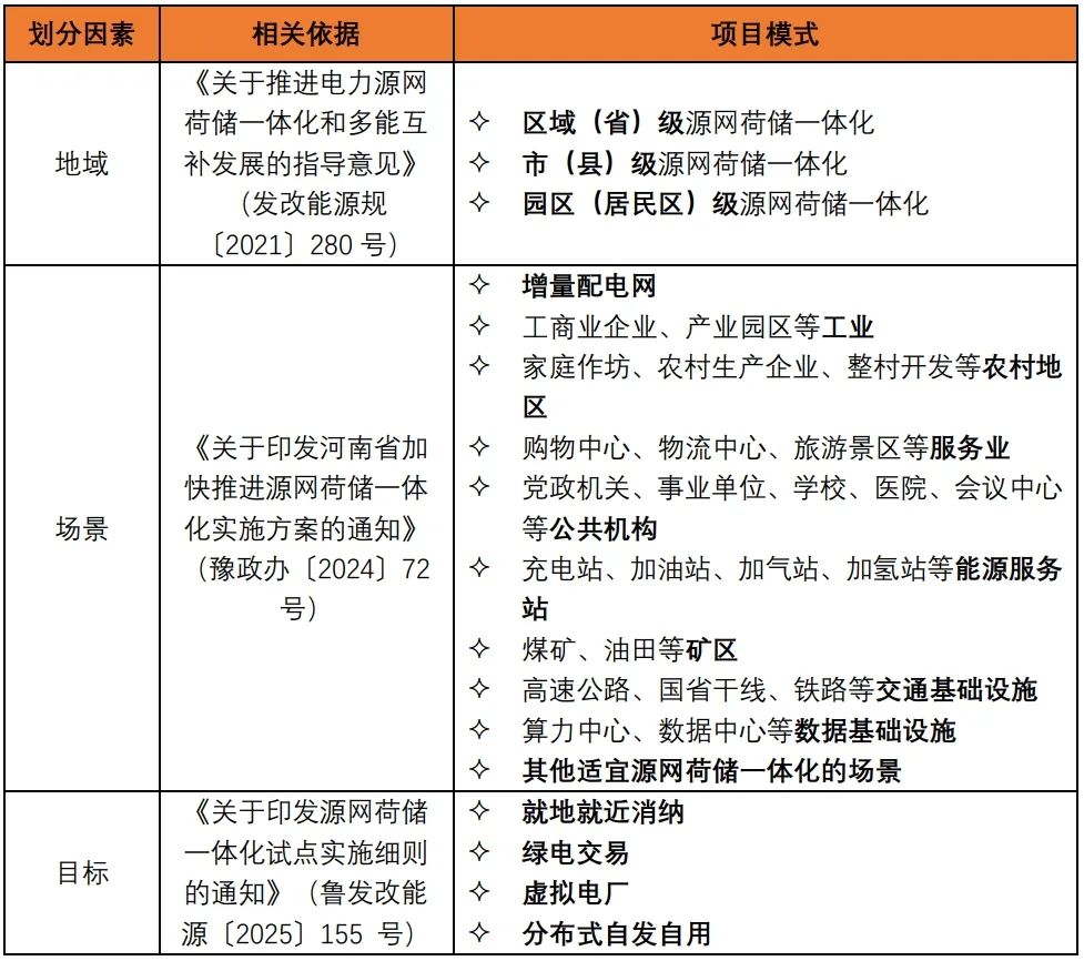 依據(jù)國家和地方層面的相關(guān)規(guī)定,按照地域、場景、目標(biāo)等劃分因素,源網(wǎng)荷儲一體化項(xiàng)目有以下主要模式: