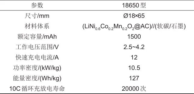 本工作以兼具超級(jí)電容器高功率、長(zhǎng)壽命和高比能特性的電容型18650鋰離子電池[合盛新能(寧波)科技有限公司]為研究對(duì)象,相關(guān)參數(shù)如表1所示。利用電池充放電測(cè)試儀(NGI-N5600A-10A)采用恒流恒壓方式將電池充放電至額定SOC。電池極耳連接采用集流體端面揉平方案,實(shí)現(xiàn)全極耳的軟連接的電連接。