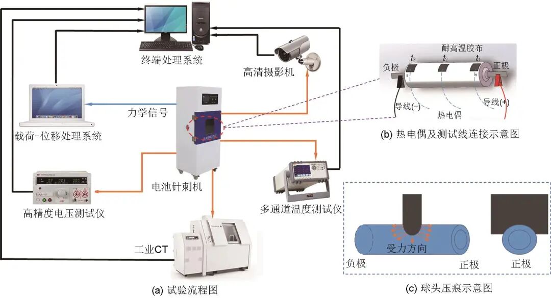 選擇深圳三思縱橫科技股份有限公司生產(chǎn)的suns縱橫風(fēng)暴系列的電子萬(wàn)能試驗(yàn)機(jī)作為球頭壓痕試驗(yàn)機(jī)器,選用直徑為1 mm的抗高溫球頭對(duì)電池進(jìn)行擠壓,利用載荷-位移處理系統(tǒng)控制球頭進(jìn)程并實(shí)時(shí)輸出載荷數(shù)值,搭配多通道溫度測(cè)試儀、高精度電壓測(cè)試儀、高清攝像頭等實(shí)驗(yàn)儀器記錄相關(guān)現(xiàn)象與數(shù)據(jù),利用CT技術(shù)對(duì)壓痕過(guò)程進(jìn)行全程動(dòng)態(tài)跟蹤掃描,分析電池的內(nèi)部變形與結(jié)構(gòu)損傷,借助SEM技術(shù)剖析正負(fù)電極的微觀形貌變化,探究壓痕內(nèi)短路發(fā)生機(jī)理。