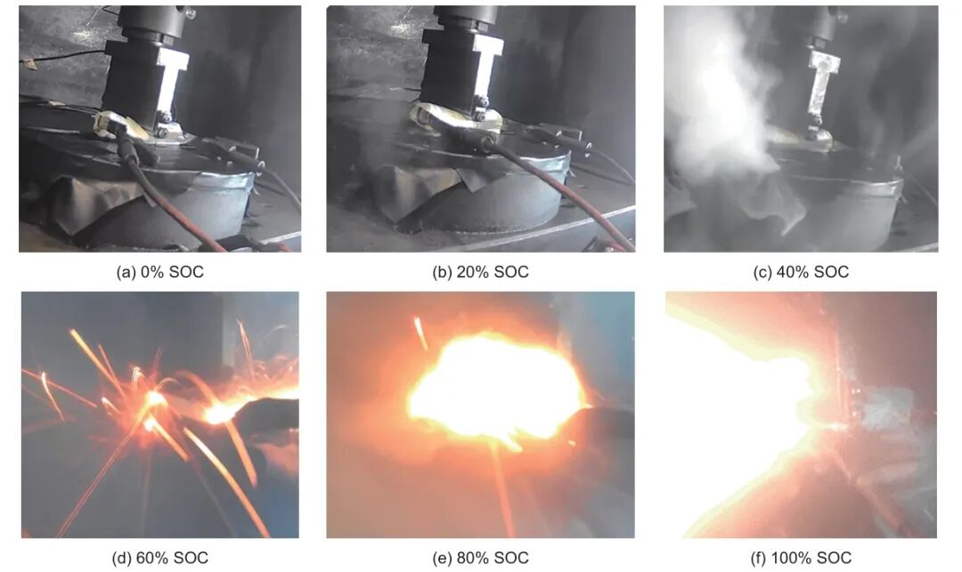 在碰撞事故中,電池會(huì)受到不同方向和程度的傷害。電池包的框架受到膨脹和擠壓,可能會(huì)對(duì)電池造成球壓的現(xiàn)象,從而觸發(fā)內(nèi)短路機(jī)制。為探究不同SOC下電池的安全特征,以1 mm/min的速度對(duì)0%、20%、40%、60%、80%和100% SOC的鋰離子電池進(jìn)行壓痕試驗(yàn),且達(dá)到9 mm壓痕停止工作。試驗(yàn)結(jié)果如圖2所示,當(dāng)SOC為0%、20%時(shí),電池僅出現(xiàn)電解液外流,見(jiàn)圖2(a)、(b),SOC為40%時(shí),出現(xiàn)淡煙,伴有刺激性氣體產(chǎn)出,電解液外流現(xiàn)象更嚴(yán)重,見(jiàn)圖2(c),以上測(cè)試樣品均未發(fā)生熱失控。SOC為60%時(shí),正極側(cè)、負(fù)極側(cè)出現(xiàn)大量濃煙,安全閥被打開(kāi),正極側(cè)噴射火花,隨之負(fù)極側(cè)也噴射火花,最終電池多區(qū)域同時(shí)發(fā)生火花噴射現(xiàn)象,見(jiàn)圖2(d),電池發(fā)生熱失控。SOC為80%和100%時(shí),火花噴射現(xiàn)象后,電池持續(xù)燃燒約7 s,熱失控現(xiàn)象進(jìn)一步加劇,見(jiàn)圖2(e)、(f)。