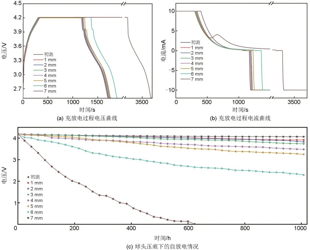 選取0% SOC的18650電容型鋰離子電池7只,中部分別壓痕至1 mm、2 mm、3 mm、4 mm、5 mm、6 mm和7 mm,利用充放電測(cè)試儀恒流恒壓充電至滿電狀態(tài),隨后進(jìn)行擱置,利用電壓表每24 h測(cè)量一次實(shí)時(shí)電壓,共統(tǒng)計(jì)1000小時(shí)的擱置電壓數(shù)據(jù)。由圖7(c)可知,隨著壓痕深度的增大,自放電現(xiàn)象逐漸加重,壓痕深度為0~3 mm時(shí),電池自放電變化不明顯。壓痕至4 mm、5 mm時(shí),1000 h的擱置電壓分別為3.47、3.24 V。壓痕深度為6 mm時(shí),電池脫嵌鋰能力進(jìn)一步下降,一部分鋰離子與電子發(fā)生中和反應(yīng),電壓有一定幅度下降。7 mm壓痕深度測(cè)試樣品自放電現(xiàn)象最嚴(yán)重,電壓在擱置624 h后降為0 V。
