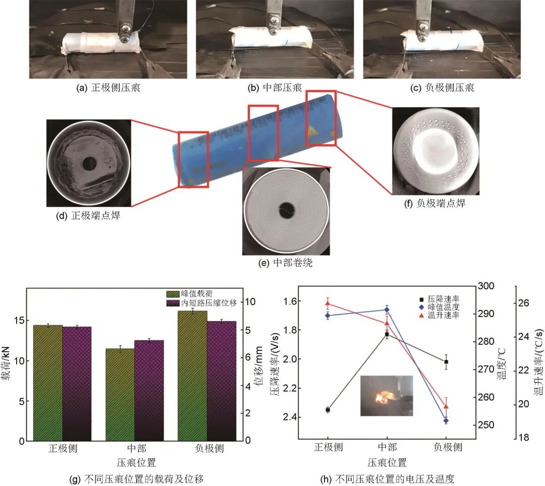 電池正極側(cè)、中部、負(fù)極側(cè)結(jié)構(gòu)有所不同,因此球頭壓痕過(guò)程中,壓痕位置不同,實(shí)驗(yàn)效果也會(huì)有所不同。選擇60% SOC 18650電容型鋰離子電池,補(bǔ)充對(duì)電池正極側(cè)與負(fù)極側(cè)的球頭壓痕實(shí)驗(yàn),如圖6(a)~(c)所示。正負(fù)極兩端與外殼所構(gòu)成的結(jié)構(gòu)完整性更強(qiáng),見(jiàn)圖6(d)、(f),承載能力也就越強(qiáng)。而電池外殼中部與電芯層之間存在間隙,見(jiàn)圖6(e),受力較薄弱。圖6(g)展示了不同壓痕位置造成的峰值載荷及失效位移。正極側(cè)、中部、負(fù)極側(cè)位置峰值載荷分別為14.36 kN、11.44 kN、16.14 kN,中部壓痕載荷值小于兩側(cè)位置,負(fù)極側(cè)峰值載荷最大。內(nèi)短路時(shí)的壓痕位移也呈現(xiàn)同樣的變化規(guī)律,如圖6(h)所示,正極側(cè)壓降速率更大,更容易發(fā)生內(nèi)短路,這是因?yàn)檎龢O結(jié)構(gòu)易發(fā)生損壞,且靠近安全閥;中部位置峰值溫度最高,這是因?yàn)閮?nèi)短路發(fā)生在電芯中部,溫度蔓延效應(yīng)的導(dǎo)致兩側(cè)溫度升高,可燃燒活性物質(zhì)更多,燃燒更加充分。正極側(cè)位置溫升速度更大,這是因?yàn)檎龢O離火花噴射點(diǎn)位置更近。綜上可知,正極側(cè)位置的球頭壓痕更易發(fā)生內(nèi)短路現(xiàn)象,對(duì)電池的整體破壞更強(qiáng)。