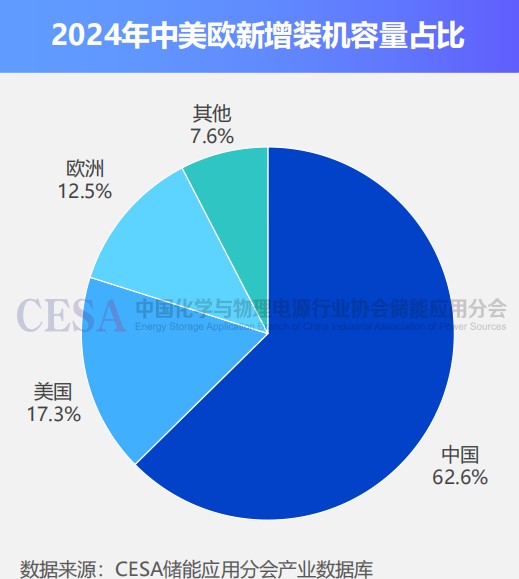 在政策驅(qū)動下,儲能市場正經(jīng)歷從“規(guī)模擴(kuò)張”向“智能升級”的關(guān)鍵轉(zhuǎn)型。據(jù)國際能源署(IEA)及CESA 儲能應(yīng)用分會產(chǎn)業(yè)數(shù)據(jù)庫統(tǒng)計,2024年全球新型儲能市場新增裝機(jī)規(guī)模為74.2GW/175GWh,同比+52.67%/+69.08%,中國、美國、歐洲三大市場裝機(jī)占比在90%以上, 中國新增裝機(jī)占比超過60%。