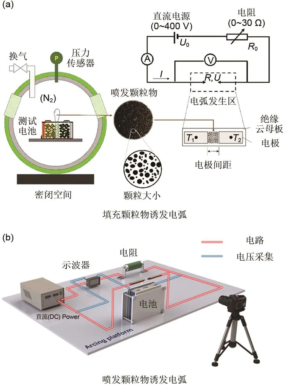 2024年,Li等設計了電池熱失控噴發(fā)顆粒物誘發(fā)電弧的實驗裝置,該裝置包括直流電源(電壓U0)、由相距一定距離的電極片組成的電弧產生區(qū)域(區(qū)域電壓U,電阻R)、負載電阻R0、電流表,高速數(shù)據(jù)采集器等,顆粒填充在電極間隙中模擬電池噴發(fā)后顆粒沉積引發(fā)電弧的情況,如圖4(a)所示。圖中I為回路電流,T1和T2是布置在電極片上的熱電偶,采集電弧發(fā)生后電極上的溫度變化。在密閉環(huán)境中收集熱失控噴發(fā)顆粒后,利用搭建的可調節(jié)電極間距、負載電阻的測試系統(tǒng),分別研究了顆粒尺寸、電極間隙、回路電阻與電弧臨界電壓的關系。對于Li(Ni0.8Co0.1Mn0.1)O2鋰離子電池,其顆粒誘發(fā)電弧的臨界擊穿電壓最低為(99±5) V(電極間距為1 mm),在4 mm電極間距下為(155±5) V(僅為空氣擊穿電壓的1.2%)。揭示了熱失控噴發(fā)過程中局部電暈放電、顆粒誘發(fā)電弧和過渡態(tài)電弧3種電弧模式。