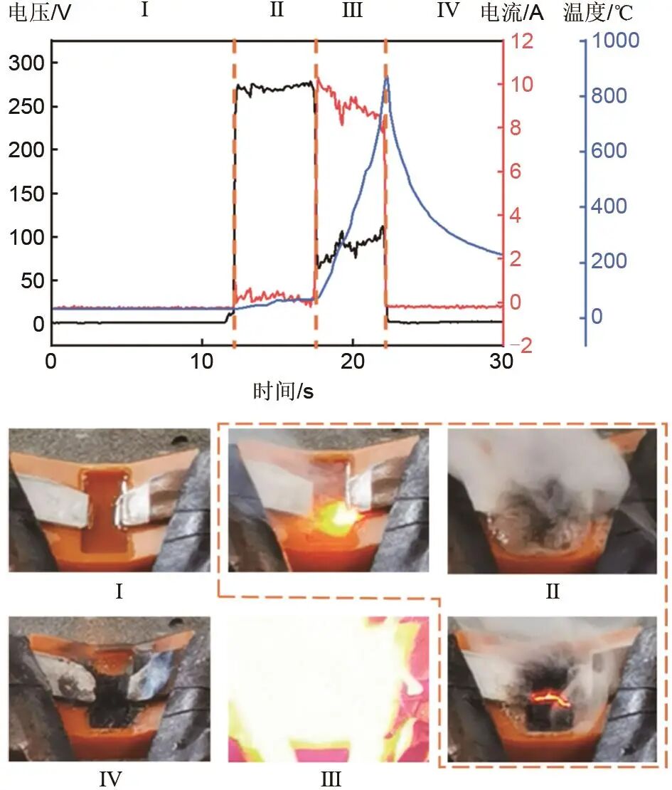 在實驗準備就緒后開始進行電解液誘發(fā)電弧的實驗,如圖7所示。該實驗電路由一個0~1000 V的直流電源控制,直流電源在第12 s的時候開啟并施加235 V的電壓,可以看到在電源打開的一瞬間電極和電解液之間出現(xiàn)了1 s的電光,但是該現(xiàn)象并未將兩極片導通發(fā)生拉弧,這也是由前面所分析的電解液不導電所致的,可能只是電源打開的一瞬間,電壓瞬間增加、溫度也瞬間增大。隨后,18~28 s之間電解液由于高壓電產生的高溫迅速蒸發(fā)并伴隨著白煙,蒸發(fā)后電解液變成黑色的糊狀物,與此同時28~30 s之間黑色糊狀物的表面出現(xiàn)弧狀閃光,伴隨著2 s的弧狀閃光逐漸變亮,在第30 s的時候突然發(fā)生拉弧并伴隨劇烈的弧光,此刻鏡頭無法記錄電弧的形狀,觀測到耀眼的弧光,測溫點的溫度在30~39 s之間迅速增加到890 ℃左右,此刻根據(jù)測溫點的溫度和弧光的顏色可以推測電弧發(fā)生位置的溫度在6000 ℃左右。電弧結束后依然有微弱的火焰存在并持續(xù)了1 s,而后經過觀察發(fā)現(xiàn)鋁電極的表面出現(xiàn)非常嚴重的燒蝕痕跡,并且鋁電極的部分結構已經發(fā)生了熔融。