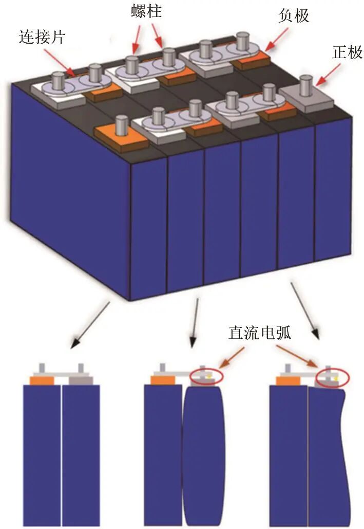 在儲能系統(tǒng)和電動車輛中,為滿足系統(tǒng)的功率輸出要求,電池系統(tǒng)將多個電池單元和模組進行串并聯(lián)。因此,系統(tǒng)內部串并聯(lián)結構的穩(wěn)定性對系統(tǒng)安全性至關重要。在電池系統(tǒng)的循環(huán)過程中,由于電池老化、膨脹或機械應力等因素,連接電池的焊點可能會松動或斷裂。這將導致電池之間的連接點處形成電弧,如圖8所示。因此,電弧放電加上高溫影響可能會導致電池端子和連接器出現(xiàn)嚴重的電化學腐蝕問題。這不僅顯著縮短電池壽命,更嚴重威脅系統(tǒng)運行安全,甚至可能觸發(fā)熱失控連鎖反應導致火災。