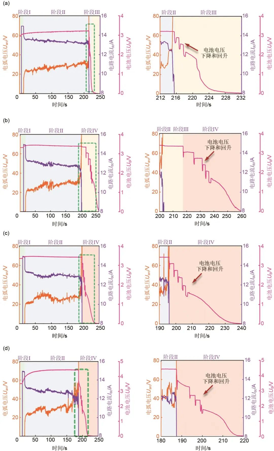 首先,研究了不同SOC情況下電弧對電池的影響。圖10展示了4種不同SOC水平下電池電弧演變的系列過程,可分為4個階段:階段Ⅰ弧前啟動,階段II電弧演變,階段III電弧熄滅和階段IV電池熱失控。