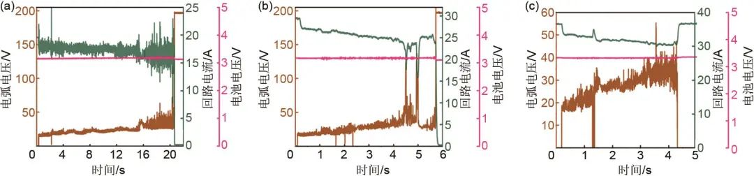 圖11 在回路電流為20 A,不同電源電壓 (a) 40 V、(b) 42 V和 (c) 50 V情況下,產生的電弧和電壓