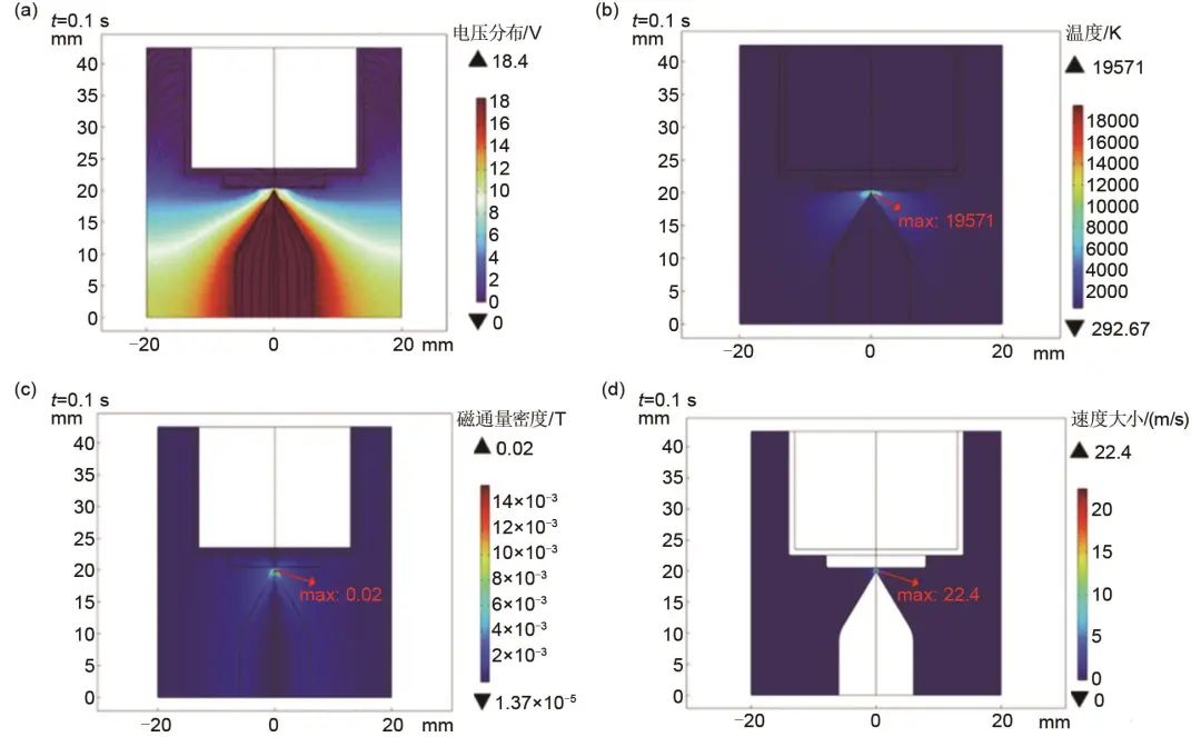 圖14 (a) 電池極柱的電弧模型;(b) 溫度場;(c) 磁通量密度;(d) 流速變化