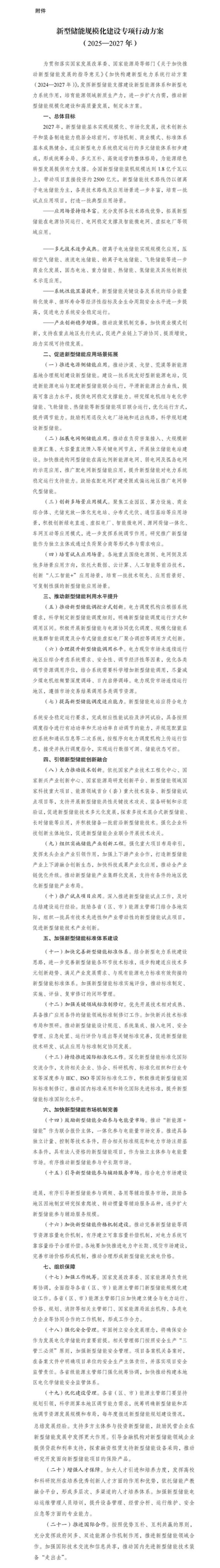 中國儲能網(wǎng)訊:9月12日,國家發(fā)展改革委、國家能源局正式印發(fā)《新型儲能規(guī)?;ㄔO(shè)專項行動方案(2025—2027年)》,明確提出到2027年,全國新型儲能裝機規(guī)模達到1.8億千瓦以上,帶動項目直接投資約2500億元,基本實現(xiàn)新型儲能的規(guī)?;⑹袌龌l(fā)展。這一政策被視為推動我國能源結(jié)構(gòu)綠色轉(zhuǎn)型、構(gòu)建新型電力系統(tǒng)的關(guān)鍵舉措,將對儲能產(chǎn)業(yè)乃至整個能源行業(yè)帶來深遠影響。