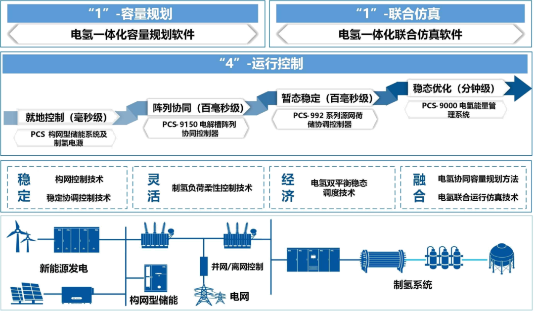 針對(duì)新能源制氫在離網(wǎng)及并離網(wǎng)場(chǎng)景下面臨的經(jīng)濟(jì)性、穩(wěn)定性和靈活性運(yùn)行難題,南瑞繼保創(chuàng)新提出“1+1+4”電氫一體化控制體系,并研制了PCS新能源電氫協(xié)同一體化控制系統(tǒng)的全系列自主可控產(chǎn)品。該系統(tǒng)依托構(gòu)網(wǎng)控制技術(shù)構(gòu)建電壓支撐體系,運(yùn)用制氫負(fù)荷柔性控制技術(shù)提升電解槽集群的安全運(yùn)行與靈活調(diào)節(jié)能力;通過(guò)穩(wěn)定協(xié)調(diào)控制與電氫雙平衡穩(wěn)態(tài)調(diào)度技術(shù),實(shí)現(xiàn)電氫源荷互動(dòng),顯著增強(qiáng)了系統(tǒng)暫態(tài)穩(wěn)定性與長(zhǎng)周期經(jīng)濟(jì)性。項(xiàng)目開(kāi)發(fā)的電氫容量規(guī)劃軟件及聯(lián)合仿真系統(tǒng),支撐了電氫系統(tǒng)的深度融合,全面保障其在全生命周期內(nèi)的高經(jīng)濟(jì)性與高可靠性。