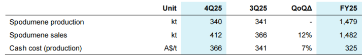現(xiàn)金流穩(wěn)定:月度定價(jià)(M-1)使價(jià)格調(diào)整及時(shí),避免庫存減值風(fēng)險(xiǎn),2025年Q4經(jīng)營活動(dòng)現(xiàn)金流4000萬澳元,為后續(xù)擴(kuò)產(chǎn)(CGP3項(xiàng)目)提供資金保障。