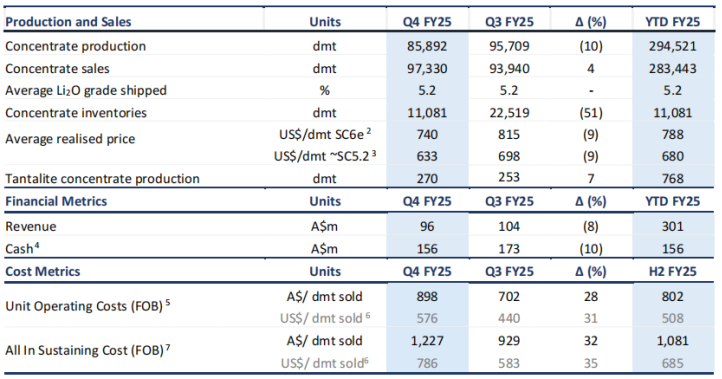 Liontown在財(cái)報(bào)中解釋,2025年Q4為應(yīng)對(duì)庫存壓力,向ChengxinLithium額外出售1.5萬噸精礦,采用現(xiàn)貨折價(jià)及預(yù)付款模式,折價(jià)比例降至19.5%,較長單低0.5%,但獲得500萬美元預(yù)付款,緩解現(xiàn)金流壓力,反映庫存對(duì)折價(jià)的短期影響。