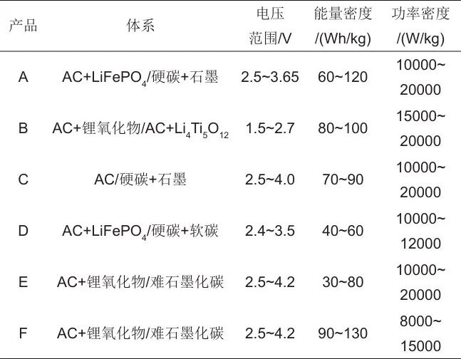 表2 已實(shí)現(xiàn)產(chǎn)業(yè)化應(yīng)用的混合型超級(jí)電容器主要參數(shù)