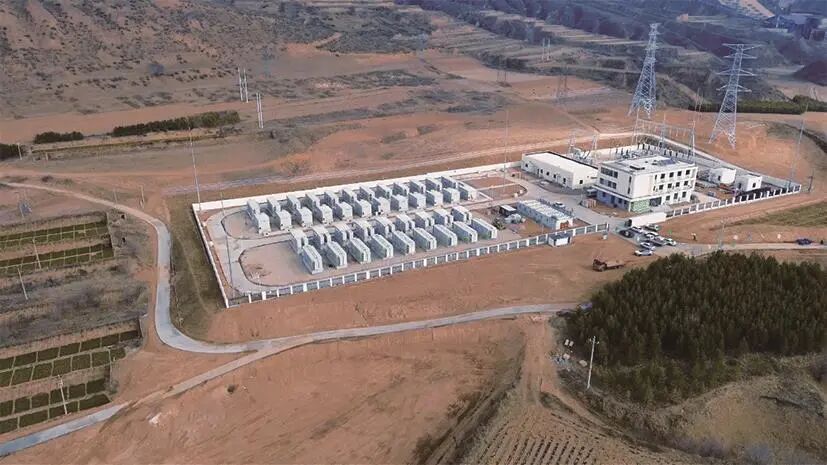 目前,我國已經(jīng)于山西省偏關(guān)縣建成了全球最大獨(dú)立調(diào)頻電站,整體采用58 MW/30 s超級(jí)電容系統(tǒng)+42 MW/42 MWh鋰電池系統(tǒng)組成,成功入選2025年4月國家發(fā)展改革委《綠色低碳先進(jìn)技術(shù)示范項(xiàng)目清單(第二批)》名單。該項(xiàng)目通過快速響應(yīng)電網(wǎng)頻率波動(dòng),實(shí)現(xiàn)高頻次對電網(wǎng)小頻率波動(dòng)的充分調(diào)節(jié),保持了電網(wǎng)的穩(wěn)定性,可為20倍于自身規(guī)模的新能源發(fā)電消納提供調(diào)頻支撐,項(xiàng)目現(xiàn)場如圖6所示。