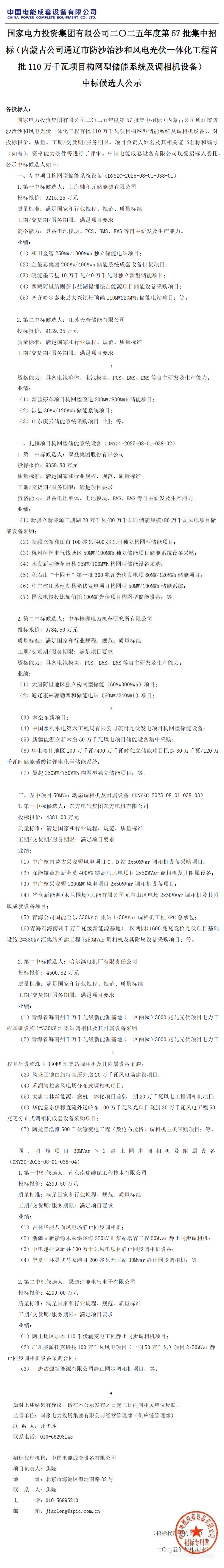 中國儲能網(wǎng)訊:近日,國家電力投資集團有限公司二〇二五年度第57批集中招標(內(nèi)蒙古公司通遼市防沙治沙和風電光伏一體化工程首批110萬千瓦項目構網(wǎng)型儲能系統(tǒng)及調(diào)相機設備)中標候選人公示。其中包含左中項目構網(wǎng)型儲能系統(tǒng)設備和扎旗項目構網(wǎng)型儲能系統(tǒng)設備中標候選人公示。