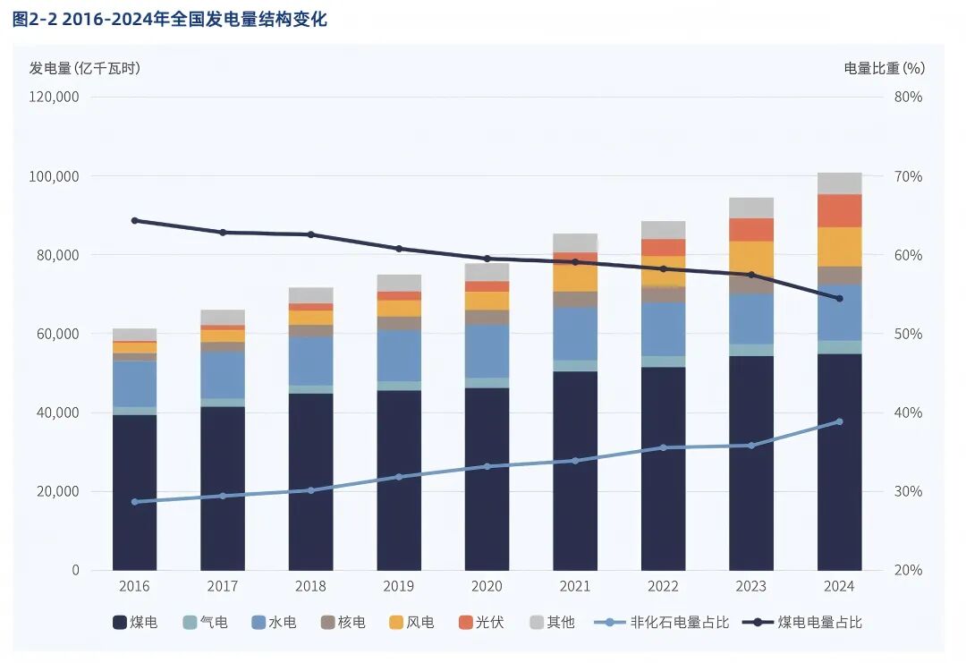 在發(fā)電量方面,非化石能源發(fā)電量穩(wěn)步增長(zhǎng),但煤電仍是當(dāng)前中國(guó)電力供應(yīng)的主要電源。2024年,中國(guó)發(fā)電量10.09萬億千瓦時(shí)。其中,非化石能源發(fā)電量3.92萬億千瓦時(shí),占全口徑總發(fā)電量的比重為38.8%;風(fēng)電和光伏發(fā)電量二者合計(jì)占全口徑總發(fā)電量的18.1%。煤電機(jī)組以35.5%的裝機(jī)占比提供了54.8%的發(fā)電量,為5.5萬億千瓦時(shí),相比2016年煤電發(fā)電量占比(64.3%)下降9.5%。