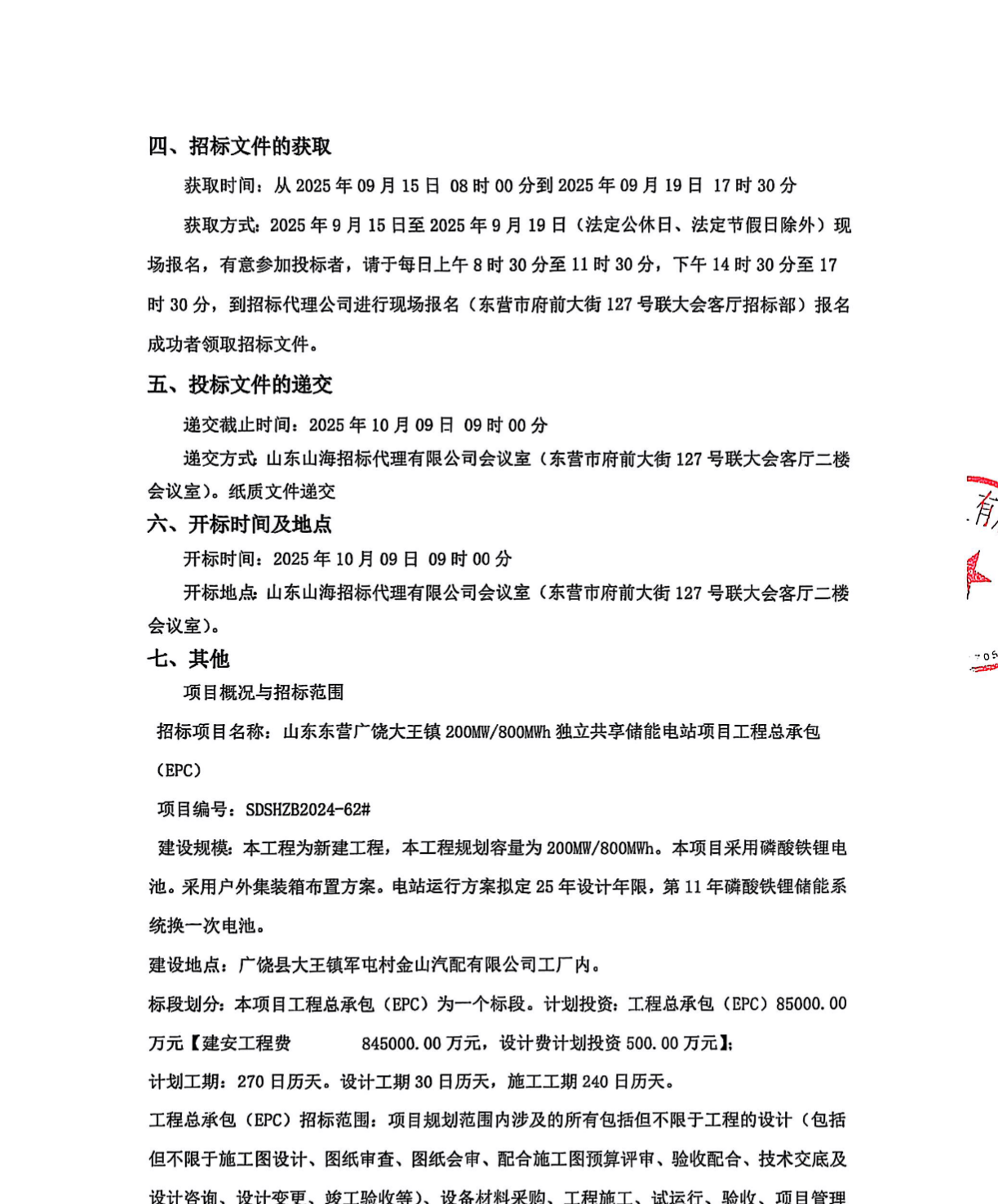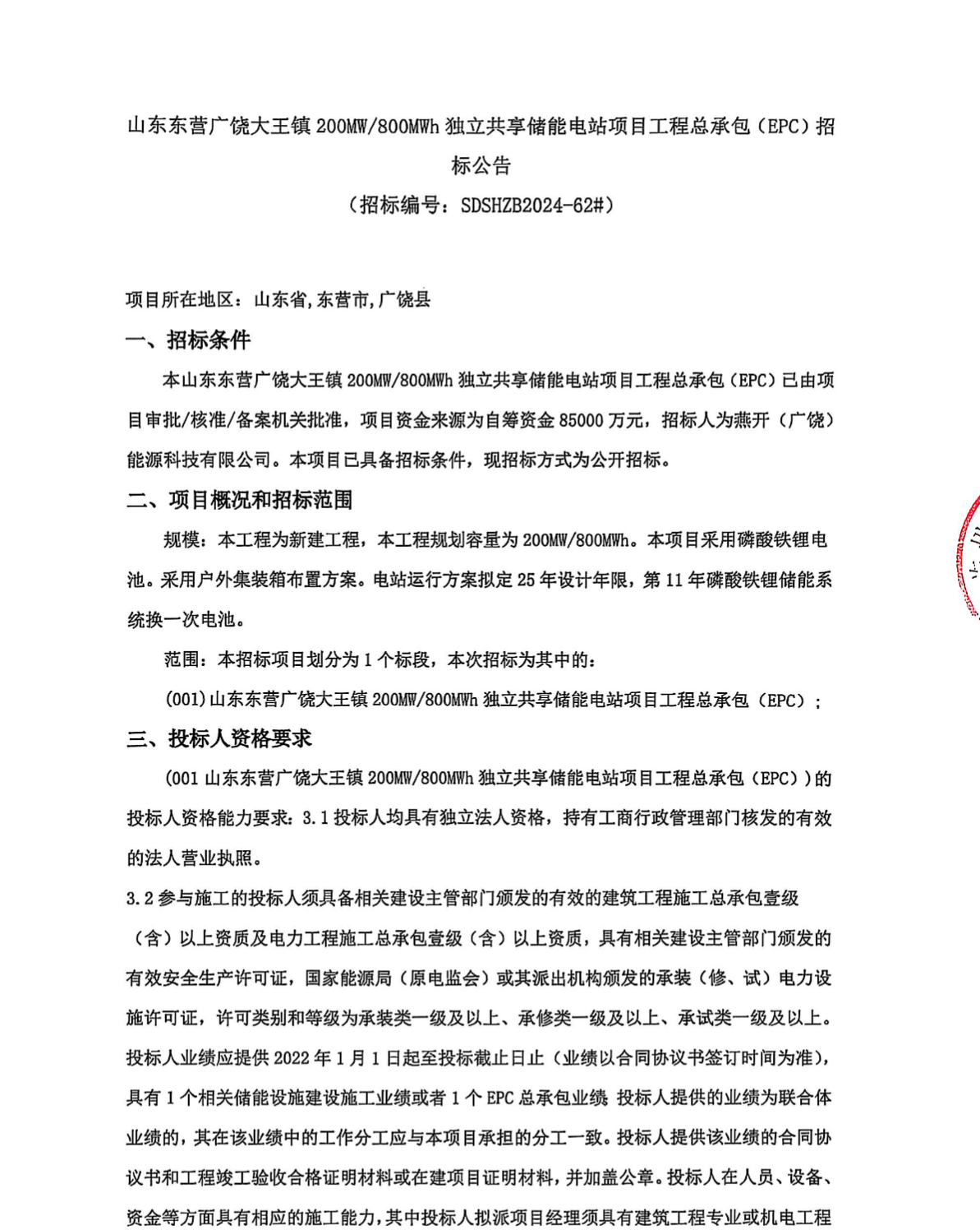 中國(guó)儲(chǔ)能網(wǎng)訊:9月12日,山東東營(yíng)廣饒大王鎮(zhèn)200MW/800MWh獨(dú)立共享儲(chǔ)能電站項(xiàng)目工程總承包(EPC)招標(biāo)。