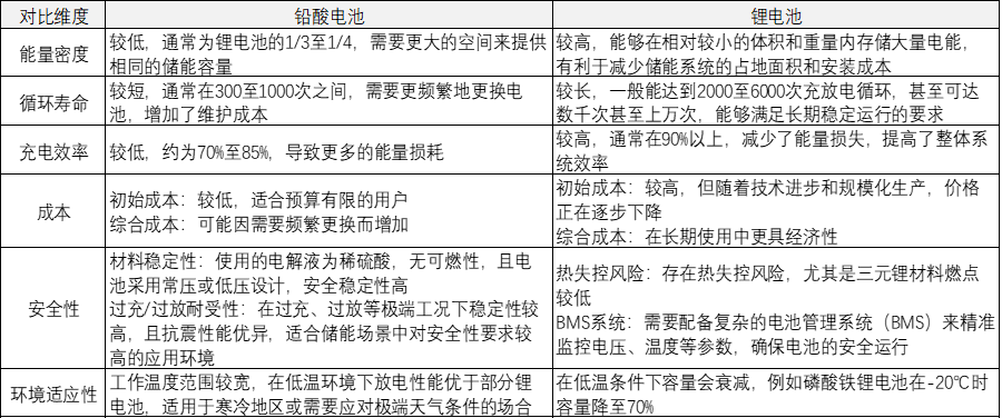 鉛酸電池成本低,適合預算有限且空間充足的場景(如農村家庭供電);鋰電池能量密度高、壽命長,適用于空間有限或要求較高的場景(如通信基站、應急電源)。